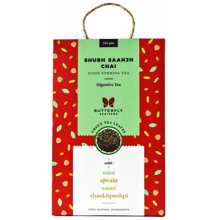 Butterfly Ayurveda Shubh Saanjh Chai Green tea Leaves Butterfly Ayurveda Shubh Saanjh Chai Green tea Leaves is a herbal tea specially made for the evenings to pacify the Vata dosha. It helps to combat gas, flatulence, indigestion and bad breath. It has an aftertaste of mint and ajwain that keeps the breath fresh.