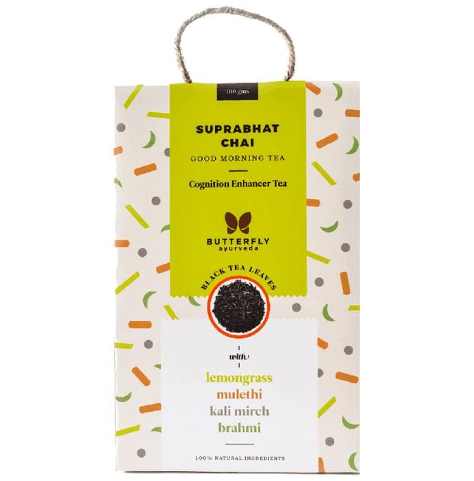 Butterfly Ayurveda Suprabhat Chai Black Tea Leaves with Lemongrass is a blend of Kapha balancing herbs like lemongrass, kali mirch and brahmi with the most delicate Assam black tea leaves. This sweet herbal tea helps balance the Kapha dosha, boosts liver health and supports a healthy nervous system. | Key Ingredients: Lemongrass (Cymbopogon citrates) Kali mirch (Cymbopogan citatus) Brahmi (Bacopa monnieri) Assam black tea leaves | Key Benefits: It helps in balancing the Kapha dosha It stimulates the immune system and boosts immunity It helps to detox the liver and supports its functioning It energises the nervous system and enhances its function | Directions For Use: Use as directed on the label | Safety Information: Read the label carefully before use Store in a cool and dry place, away from sunlight Store in an airtight container after opening