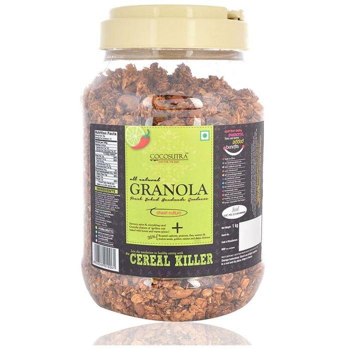 Cocosutra Breakfast Granola Chaat Culture Cocosutra Breakfast Granola is a healthy food snack made with oats, honey, nuts, seeds, fruit puree and signature spice blends are mixed and slow roasted with patience and passion to golden clusters of crunchy perfection, which are then topped with dried fruit.It is a delicious and nutritious snack which is free from artificial preservatives.It is available in Chia soya chocolate chunk,Crunchy tropical sunshine,Millet Mocha crunch and Peanut Butter chocolate chunk variants.