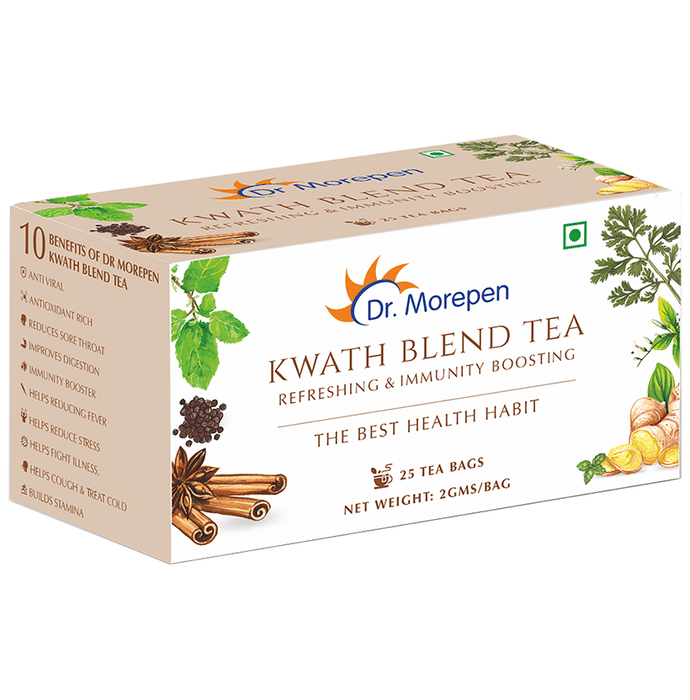 Dr. Morepen Kwath Blend Tea Bag (2gm Each) Dr. Morepen Kwath Blend Tea Bag is a unique blend of power-packed Ayurvedic ingredients. This blend makes for an effective herbal concoction that has a broad range of health-promoting effects, including immunity enhancement, combating viral infections, soothing sore throat, stimulating digestion, relieving stress, and others. Rooted in the trusted science of Ayurveda, Kwath tea is considered to be one of the oldest and most potent forms of herbal concoction for various ailments. Regular consumption of this tea will impart holistic health benefits.