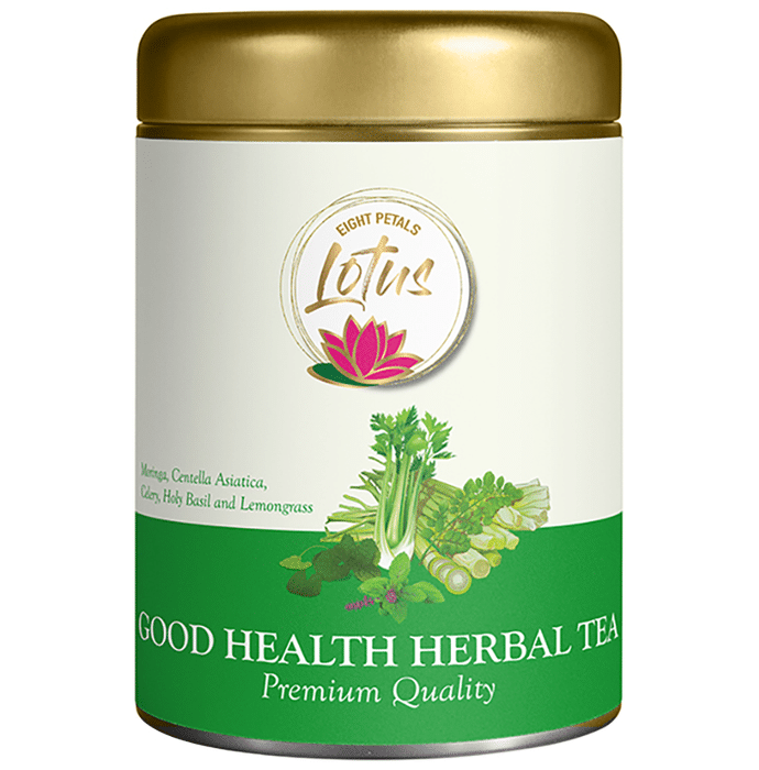 Eight Petals Lotus Good Health Herbal Tea Leaves is a potent antioxidant, which builds the body's immunity and has anticarcinogenic properties. This tea act as a stress buster and helps in rejuvenating the body and mind. Magical herbs are blended to ensure providing the right amount of proteins, calcium, vitamins and potassium so the body stays agile, fit, energetic, strong and healthy. | Key Ingredients: Moringa Centella asiatica Celery Holy basil Lemongrass | Key Benefits: It lifts the mood as it is very refreshing and enhances cognitive function It helps to enhance the immunity level of the body It helps to provide energy to the body | Directions For Use: Read the label carefully before use | Safety Information: Do not exceed the recommended dosage Store in a cool and dry place away from direct sunlight Keep out of reach of children