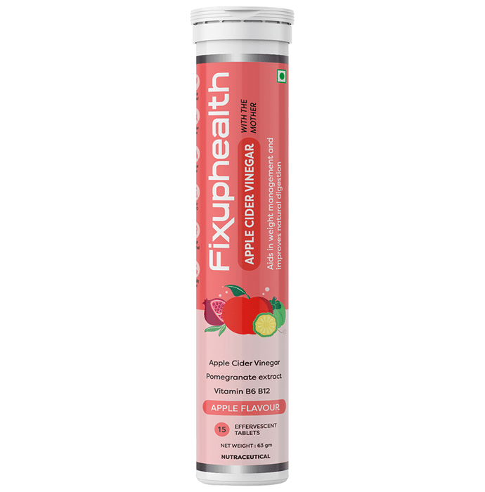 Fixuphealth Apple Cider Vinegar Effervescent Tablet with the Mother (15 Each) Apple Fixuphealth Apple Cider Vinegar Effervescent Tablet with the Mother (15Each) Apple is a deliciously flavoured apple cider vinegar effervescent tablet available in apple flavour and is enriched with vital nutrients. It is a natural detoxifier beneficial in healthy weight management that helps cleanse the colon. The power of antioxidant-rich pomegranates and beetroot extracts helps improve the microbiome and promotes gut health. It is vegetarian, has zero junk, is a gluten and allergen-free formula