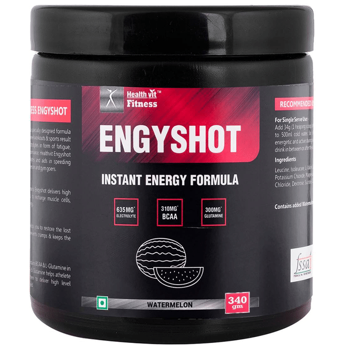 HealthVit Fitness Engyshot Instant Energy Formula Powder Watermelon Healthvit Fitness Engyshot Instant Energy Formula Powder is a specially designed formula to give instant energy. Heavy level workouts & sports result in the toss of fluids and electrolytes in form of fatigue, reduced energy, and less performance. Healthvit Fitness Engyshot helps to restore lost electrolytes and aids in speeding recovery in athletes, sports person, and gym goers.