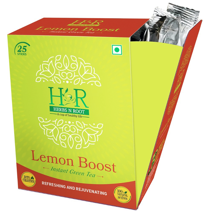 Herbs N Root Lemon Boost Instant Green Tea Stick (2gm Each) is a smooth and delicious blend. This refreshing and revitalizing tea will not only rehydrate you but will also provide you with the combined health benefits of green tea, lemon peel, and orange peel. Enjoy the aroma of sparkling lemon flavour and aromatic green tea any time of the day with its fresh, rejuvenating taste and unmatchable antioxidant support. | Key Ingredients: Green tea extracts Lemon peel extracts Orange peel extracts Fructooligosaccharides (FOS) 450 mg Maltodextrin E551 (Prevents caking) Soy lecithin Natural and Nature Identical Lemon Flavour | Key Benefits: Provides antioxidant support Benefits overall circulatory health Helps support a healthy immune system | Directions For Use: Simply empty the tea stick in a mug Pour 150ml hot water and enjoy | Safety Instructions: Read the label carefully before use Store in a cool dry place away from direct sunlight Keep out of reach of the children