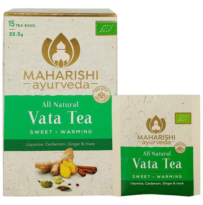 Maharishi Ayurveda All Natural Vata Tea (22.5gm Each) Maharishi Ayurveda All Natural Vata Tea That 'too-much-to-do in too-little-time' feeling can make one restless and anxious. A few sips of Vata tea may help the whirling mind settle down and body relax. Whether at work, at home, or on the road, the sweet, soothing organic Vata tea can help one stay calm and alert. A careful blend of liquorice, cinnamon, cardamom and ginger can give organic Vata tea a full and sweet taste and can help bring the disturbed Vata back into a state of balance.