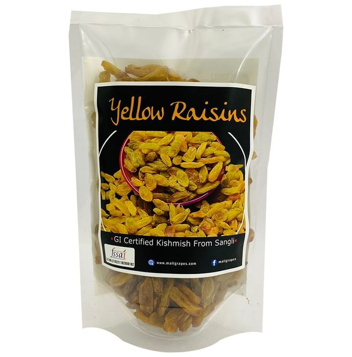 Mali Farms Yellow Raisins Mali Farms Yellow Raisins are seedless Sangli-Tasgaon black raisins that are the government of India approved GI certified ones. These raisins are long, lengthy and juicy processed in a natural way skipping the chemical polishing and oiling process to maintain their natural freshness and taste. High in quality, great in taste, Mali Farms raisins are 100% natural produce from India. Every grain of our raisin is sorted and separated in a highly hygienic environment to ensure that you get the most premium in taste and quality. These raisins are packed in a polybag and then placed in a paper box, this helps in retaining the freshness of the dried fruit. This seedless variety of raisins is soft, chewy and sweet making it an ideal snack for your little ones. Add them to your cakes or bake them into your breads. Mali Farms raisins are sure to turn your recipes into delectable delights.