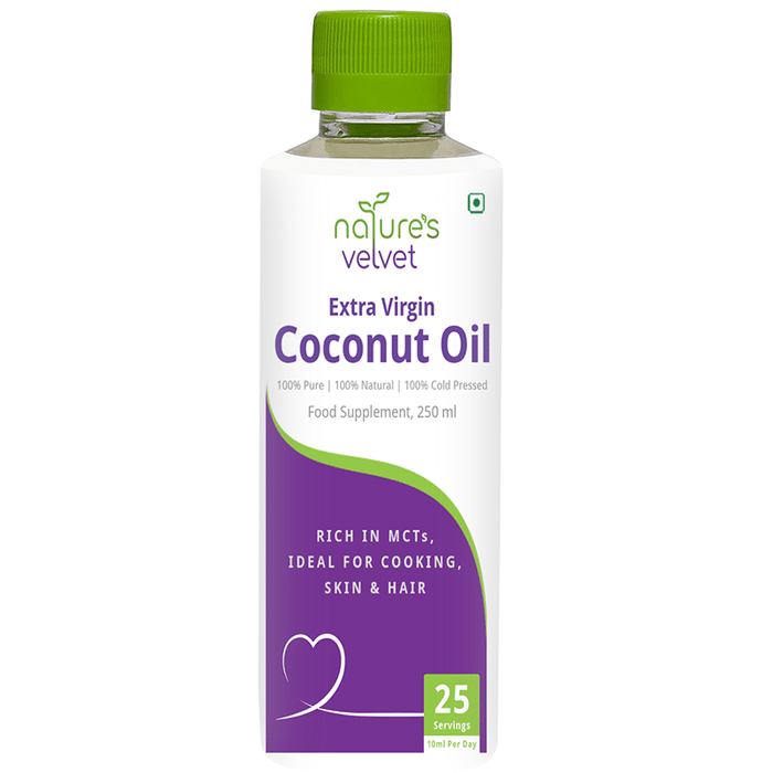 Nature's Velvet Extra Virgin Coconut Oil is a multipurpose supplement that can help enhance your overall health. The all-natural coconut oil can help manage your body mass and boost immunity. It can help strengthen the function of your brain, improve metabolism, balance hormones and serve many other purposes, both externally and internally. | Key Ingredients: Coconut oil | Key Benefits: It can aid in managing the function of the brain and digestive system The oil can help enhance immunity and metabolism It can help in managing the body weight, stimulating the production of energy The supplement can help improve healthy hair and skin It can balance the hormones and manage your overall health | Direction For Use: It can serve as cooking oil, hair and skincare oil | Safety Information: Pregnent and lactating mothers are advised to consult a doctor before use Store in a cool, dry place, away from direct sunlight Keep out of the reach and sight of children