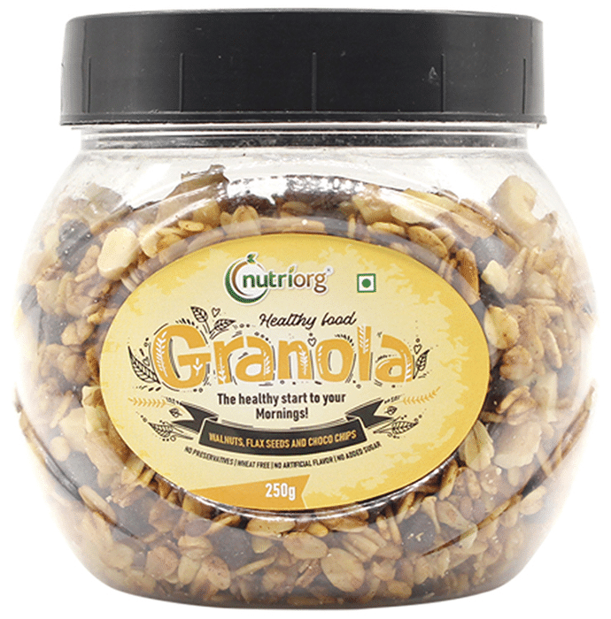 Nutriorg Granola Walnut, Flax Seeds and Choco Chips offer a healthier start to your mornings! Now enjoy your breakfast and snack healthily. It contains no added sugar, no artificial flavours or preservatives. Nutriorg Granola is available in three different healthy, and tasty flavours infused with the most nutritious ingredients and is wheat-free. | Key Ingredients: Oats Honey Walnut Flaxseeds Olive oil Choco chips Cinnamon | Key Benefits: It is rich in dietary fibre that helps to improve metabolism It provides the feeling of fullness that reduces calorie intake, further helping you reach your weight goals It contains good carbs that help provide instant energy to the body and is one of the most energetic and healthy breakfasts It includes a good amount of omega 3 and omega 6 fatty acids that will enhance 3 aspects of mental functioning: learning, memory and recall It contains a good amount of healthy fat and dietary fibre that helps reduce bad cholesterol and improves heart health | Directions For Use: Read the label carefully before use. | Safety Information: Read the label carefully before use Store in a cool and dry place away from direct sunlight Keep out of reach of children