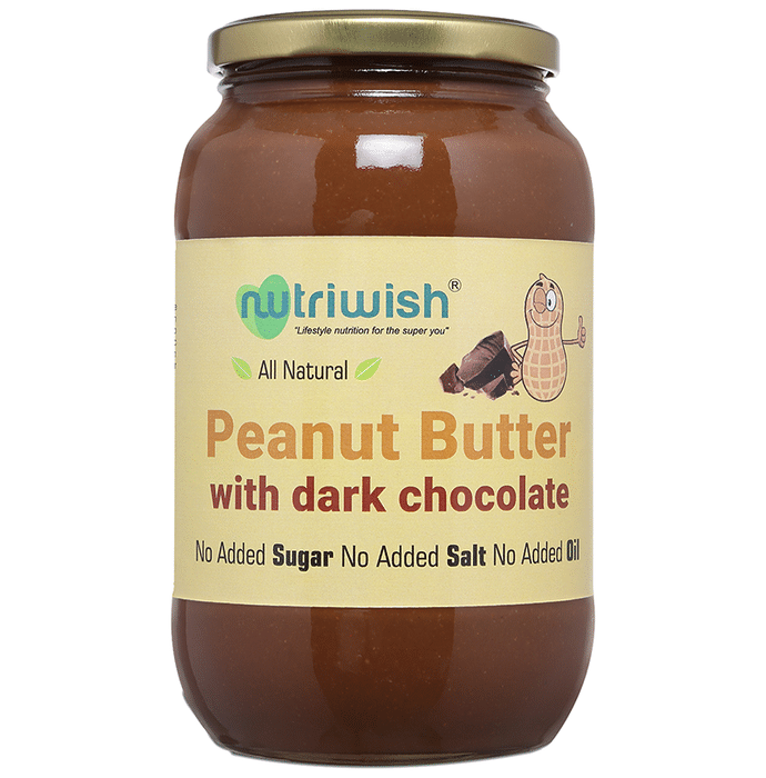 Nutriwish All Natural Peanut Butter with Dark Chocolate Nutriwish100% Natural Peanut Butter is a spreadable foodstuff made by grinding nuts into a paste. The result has a high fat content and can be spread like true butter, but is otherwise unrelated.No added sugar. No Added salt. No Added Oil. Preferably refrigerate once opened. It is normal for pure nut butter to separate into solid and liquid. Stir the contents thoroughly and the consistence will return to normal. It helps to control hunger without leading to weight gain. Moderate levels of potassium and protein are present in peanut which lowers the risk of blood pressure.