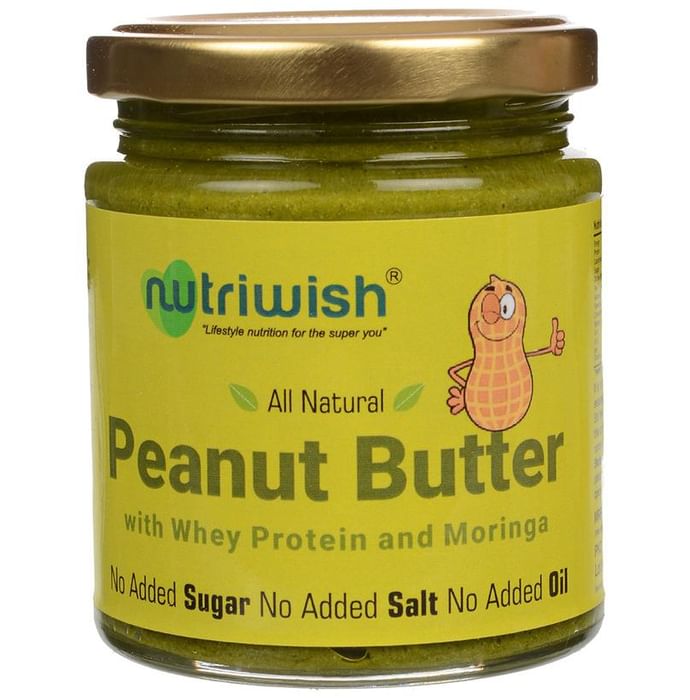 Nutriwish100% Natural Peanut with whey protein and Moringa Butter is a spreadable foodstuff made by grinding nuts into a paste. The result has a high fat content and can be spread like true butter, but is otherwise unrelated. No added sugar. No Added salt. No Added Oil. Preferably refrigerate once opened. It is normal for pure nut butter to separate into solid and liquid. Stir the contents thoroughly and the consistence will return to normal. | Key Ingredients: Peanuts Whey protein Moringa | Key Benefits: High in protein, fiber and healthy unsaturated fats Contains generous amounts of magnesium, iron and Vitamin E Can reduce hunger and help in weight management Ideal for building and preserving muscle mass | Directions For Use: Use as a healthy spread in toast, pancakes or waffles. Peanut with moringa and whey protein butter can also be incorporated into smoothies and dipping sauces. | Safety Information: Read the label carefully before use Store in a cool dry place away from direct sunlight Keep out of reach of the children Consumers with food allergies should read the ingredients list carefully