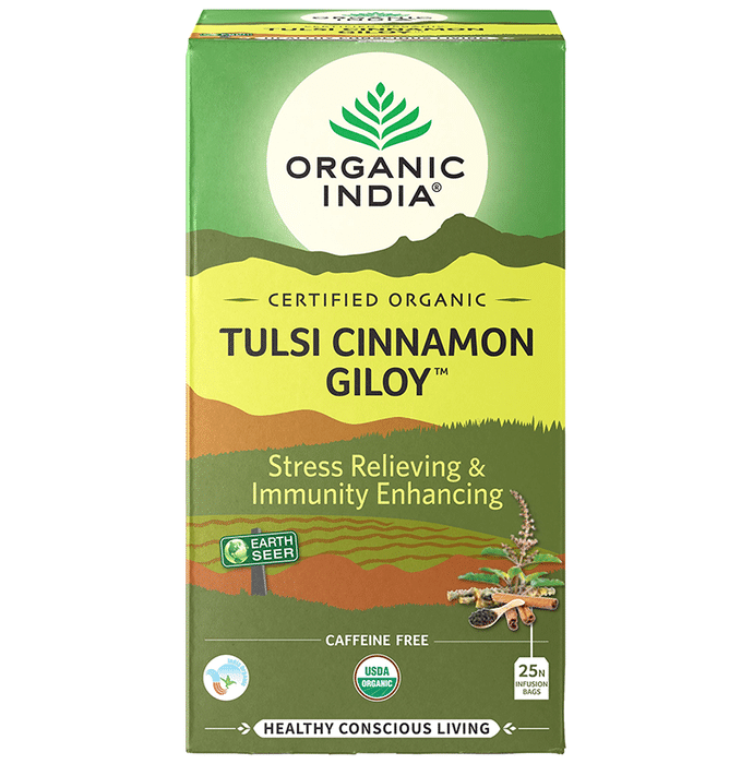 Organic India Tulsi Cinnamon Giloy Tea is enriched with the goodness of natural herbs tulsi, giloy and cinnamon. It has Kapha-balancing properties. It has anti-inflammatory and anti-allergic properties. It not only boosts immunity but also improves digestion. It protects from flu and provides relief from stress. These infusion bags are made from unbleached, biodegradable fibre. | Key Ingredients: Tulsi Giloy Cinnamon | Key Benefits: It is a powerful adaptogen It is used to help fight illnesses by strengthening the immune system It is useful in keeping cough and cold at bay The tea helps uplift one's mood It has an abundance of antioxidants It is used to reduce stress levels in the body The tea is used to build stamina It improves digestion and metabolism It is caffeine-free It is USDA organic certified | Directions For Use: For maximum health benefits, drink two or three times daily or as much as one prefers. Best consumed without milk. | Safety Information: Store in a cool and dry place Keep out of the reach of children Read the label carefully