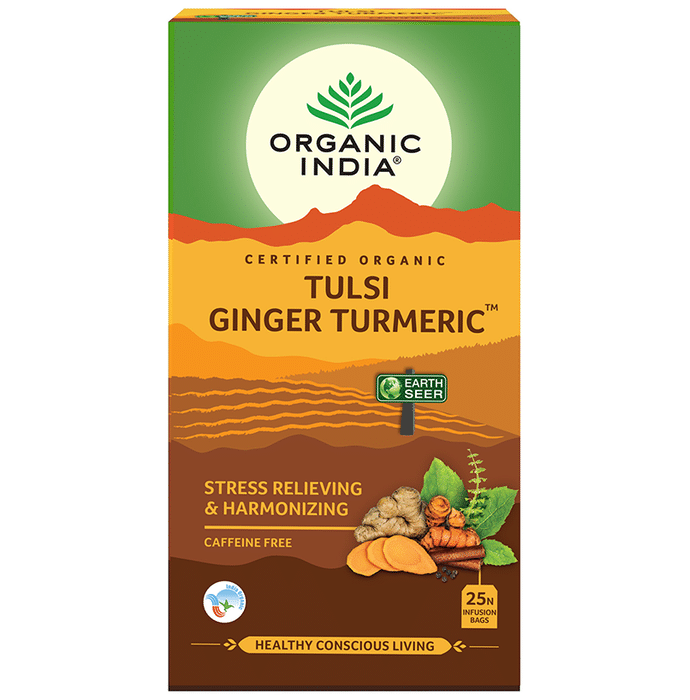 Organic India Tulsi Ginger Turmeric Tea Organic India Tulsi Ginger Turmeric Tea supports the liver and body's natural inflammatory response while building immunity. Turmeric's health-enhancing properties have been beautifully blended with ginger & cinnamon. It's a delicious drink to savour & enjoy.