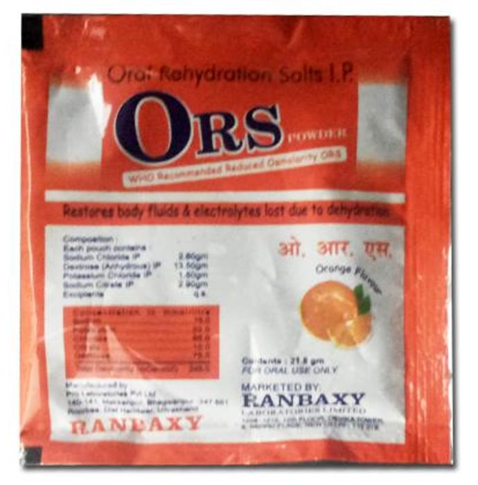 ORS Powder is a WHO based ORS (Oral Rehydration Salt) formula. Oral redyration salt is a combination of Dextrose and a number of essential electrolytes (Sodium Chloride, Potassium Chloride, Sodium Citrate). ORS Powder restores body fluids & electrolytes, lost due to dehydration in during Diarrhea, vomiting, muscle cramping, and exertional heat illness, while exercising in hot or humid weather. Role of key ingredients: Sodium Chloride (NaCl) Sodium Chloride are essential in boldy to make fluid balance. Sodium chloride is utilized by body cells for its normal function. Potassium Chloride (KCl) Potassium is an extremely important electrolyte that functions in the maintenance of water balance and distribution, acid-base balance, muscle and nerve cell function, heart function, kidney and adrenal function. Dextrose Anhydrous Dextrose anhydrous is the purest form of dextrose, commonly called glucose. Dextrose anhydrous provides instant energy. It is the primary ingredient in oral rehydration salts (ORS). Trisodium Citrate dihydrate Trisodium citrate dihydrate is a tribasic salt of citric acid. It is produced by complete neutralization of citric acid with high purity sodium source and subsequent crystallization. Directions for use: 1. Dissolve the contents of the packet in the amount of drinking water indicated on the packet, usually 1 litre. 2. If drinking water is not available, or if you are not sure the water is drinkable, boil the water for at least 10 minutes and then let cool. 3. Stir well, and give to the child to drink in a cup or spoon feed. Note: Be careful to mix the right amount of water. If you use too little water, the drink could make the diarrhoea worse. Use under medical supervision
