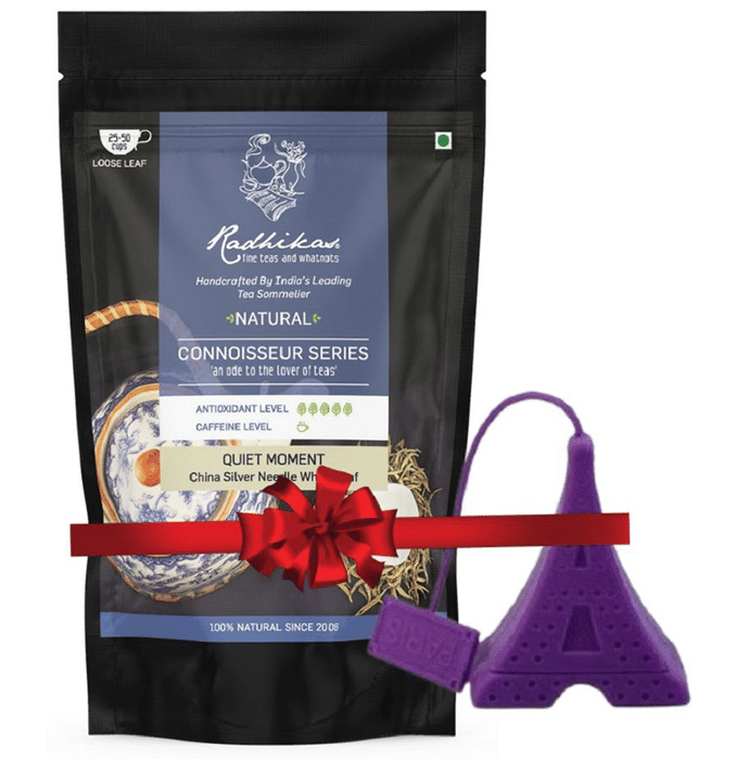 Radhikas Fine Teas Natural Connoisseur Series Quiet Moment China Silver Needle White Leaf This fine tea will make one fall in love as it is known to be the purest of all fine teas and as fresh as plucking the tea leaves and packaging it instantly, Silver Needle White Leaf Quiet-Moment Tea is the only variety that is made of the silver-tipped, tender tea buds instead of the regular tea leaves hence, the name. Sourced especially from tea partners in Fuding, this tea demands a great price owing to the special Baihao process it undergoes before claiming its place in the brand’s signature selection and reaching your cuppa. Sun-dried and least oxidised, high-quality Silver White Needle Tea is generally processed in small batches in early spring to maintain its premium quality. | Key Ingredients: White whole leaf | Key Benefits: Radhikas Fine tea is curated with love and care to form a delightful tea blend that stimulates the mind Doesn't play with sugar spikes, instead provides a balanced rejuvenation It is rich in antioxidants and anti-ageing properties that may help combat skin ageing This green tea may aid in improving digestion and weight management This tea helps in improve oral health and provides energy to get through the day | Directions For Use: Use as directed on the label or as prescribed by the physician. | Safety Information: Read the label carefully before use Store in a cool and dry place away from direct sunlight Keep out of reach of children