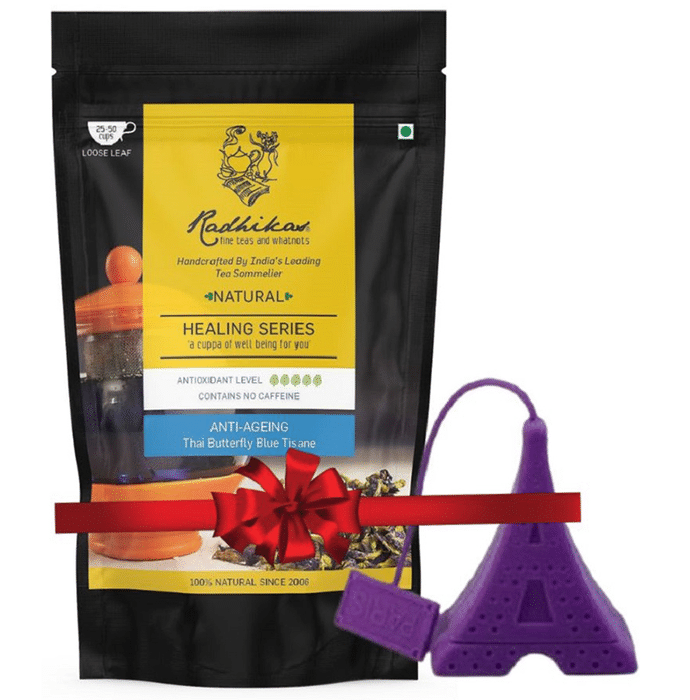 Radhikas Fine Teas Natural Healing Series Anti-Ageing Thai Butterfly Blue Tisane A native of Thailand and one of the hot sellers of Radhikas Fine Teas, this tisane is made from Butterfly Blue Pea flowers. The flowers are grown and sourced from the mountainous regions of Chiang Mai and Chiang Rai in Thailand and treated to provide a mesmerising blue-coloured infusion. Vibrant and full-bodied, this pure tisane is rich in antioxidants and is known for its anti-ageing properties. Anti-ageing Thai Butterfly Blue Tisane is the answer if one is looking for a refreshing, energising and calming tea that works as a great detox. | Key Ingredients: Butterfly Blue flower. | Key Benefits: Radhikas Fine tea is curated with love and care to form a delightful tea blend that stimulates the mind Doesn't play with sugar spikes, instead provides a balanced rejuvenation It is rich in antioxidants and anti-ageing properties that may help combat skin ageing This green tea may aid in improving digestion and weight management This tea helps in improve oral health and provides energy to get through the day | Directions For Use: Use as directed on the label or as prescribed by the physician. | Safety Information: Read the label carefully before use Store in a cool and dry place away from direct sunlight Keep out of reach of children For external use only