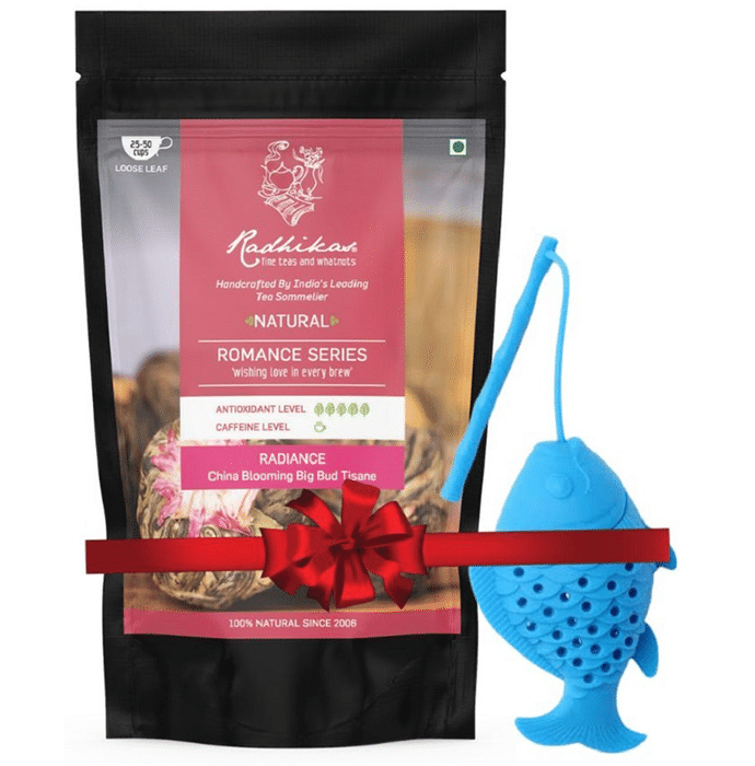 Radhikas Fine Teas Natural Romance Series Radiance China Blooming Big Bud Tisane Handpicked especially from the Fujian province of China, the Blooming Bud infusion is Radhika Fine Teas’ most popular tisane known for its theatrical performance in a teacup. Known for its visual appeal, this artisan tea is a work of art where the finest green leaves are bundled around a flower and further sewed into small balls. Relaxing and meditative, Blooming Big Bud Radiance Tisane infusion is mild, earthy, sweet and aromatic on the taste buds. | Key Ingredients: Green leaf Rosebuds Chrysanthemum bud Jasmine bud | Key Benefits: Radhikas Fine tea is curated with love and care to form a delightful tea blend that stimulates the mind Doesn't play with sugar spikes, instead provides a balanced rejuvenation It contains a high level of antioxidants and helps to boost overall health The flavonoids help aid digestion and regulate blood sugar levels | Directions For Use: Use as directed on the label or as prescribed by the physician. | Safety Information: Read the label carefully before use Store in a cool and dry place away from direct sunlight Keep out of reach of children
