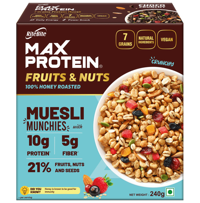 RiteBite Max Protein Muesli Munchies Fruits & Nut RiteBite Max Protein Muesli Munchies Fruits & Nut is a product which contains protein crispies, fruits, nuts, seeds and rolled barley that is high in fibre, minerals, protein and antioxidants. It can aid in appetite suppression and is enriched with fibre to keep the body healthy and manage weight.