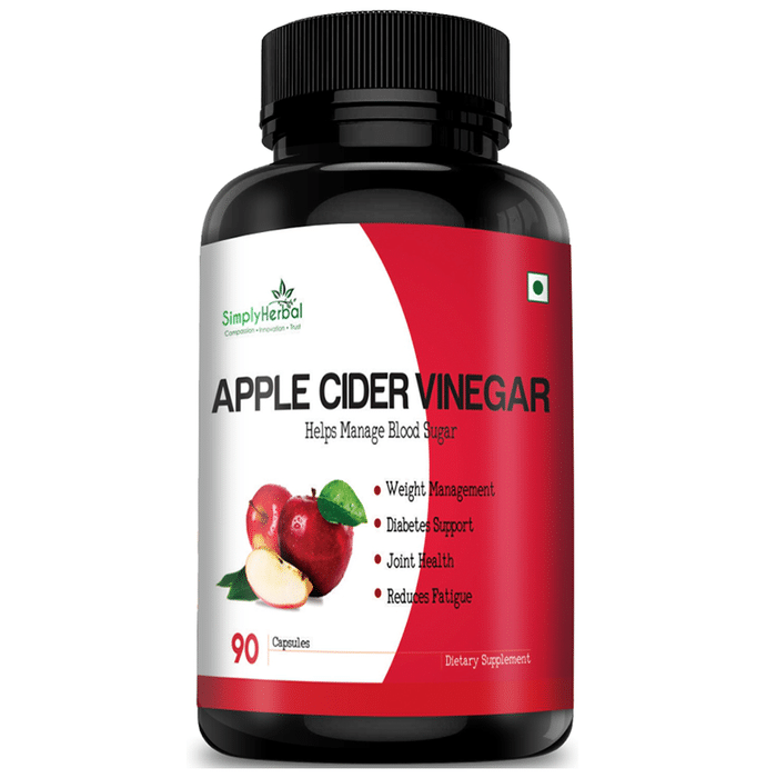 Simply Herbal Apple Cider Vinegar Capsule promotes calcium absorption from food and aids in the maintenance of joint health. It also aids in appetite regulation and weight management. It is also beneficial for controlling blood sugar. | Key Ingredients: Apple cider vinegar | Key Benefits: Simply Herbal Apple Cider Vinegar Capsule is beneficial for regulating blood sugar levels It helps in maintaining joint health and promotes the absorption of calcium from the food It also aids in regulating appetite and helps in weight management | Directions For Use: Take 1 capsule twice a day, 30 minutes before meals or as advised by your physician. | Safety Information: Read the label carefully before use Do not exceed the recommended dosage Store in a cool and dry place away from direct sunlight Keep out of reach of children
