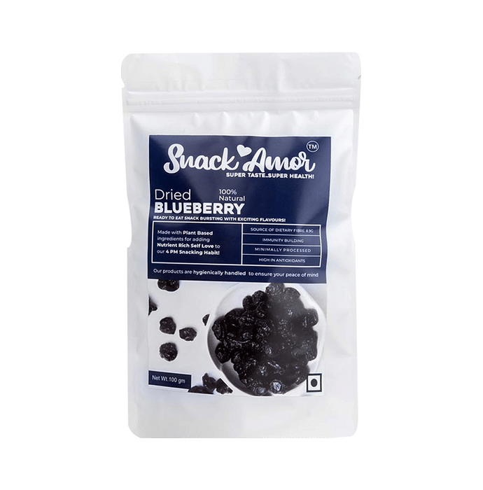 Snack Amor Dried Blueberries is high in vitamins and is low in calories. It is a healthier alternative to other snacking options. It is useful in lowering bad cholesterol content in the body. | Key Ingredients: Blueberries Sugar Sunflower Oil | Key Benefits: It has a high phosphorus and fibre content It helps satisfy cravings It helps in fighting oxidative stress It is used to lower the levels of bad cholesterol in the body Warranty: 9 months from date of packing | Directions For Use: Use as directed on the label. | Safety Information: Read the label carefully before use Store in a cool dry place away from direct sunlight Keep out of reach of the children