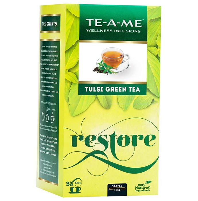 TE-A-ME Wellness Infusion Tulsi Green Tea (1.5gm Each) Restore TE-A-ME Wellness Infusion Tulsi Green Tea (1.5gm Each) is made to promote feeling of relaxation and calmness of nerves. It contains Green Tea which supports cardiovascular health and is significant for the daily weight loss regime as it decreases body fat. In addition to this, it provides relief in the case of stress.