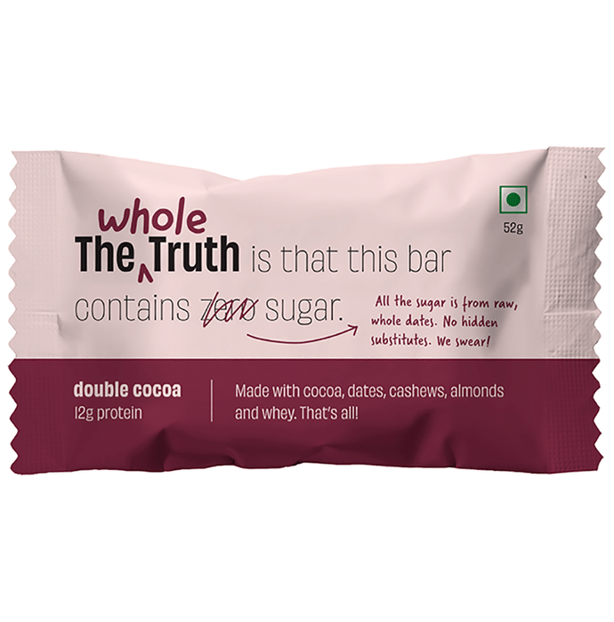The Whole Truth Protein Bar (52gm Each) Double Cocoa The Whole Truth Protein Bar is a dark fudgy chocolate bar topped with crisp roasted almonds. These protein bars are both healthy and tasty. Each bar contains 12g of protein and is free of added sugar, artificial sweeteners, gluten, soy, and any added flavour or colour.