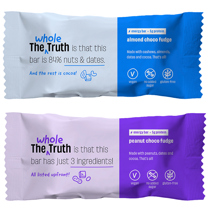 The Whole Truth Vegan Energy Bar (40gm Each) 4 Peanut Choco Fudge, 2 Almond Choco Fudge The Whole Truth Vegan Energy Bar is a nutty combo of the peanut and almond choco fudge bars. If you’re nuts about nuts, then this pack will make you go nuts. This energy bar is vegan and so does not contain any dairy products. It is free of added sugar, artificial sweeteners, preservatives, gluten, soy, and any added flavour or colour.