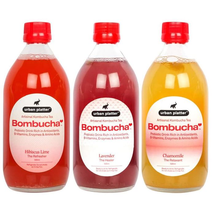 Urban Platter Artisanal Kombucha Tea (500ml Each) Variety Urban Platter Artisanal Kombucha Tea (500ml Each) is made as a natural bubbly beverage with an abundance of probiotics. It is brewed using tea and sugar through a fermentation process that requires a symbiotic culture of bacteria and yeast. It is rich in antioxidants, B-Vitamins and Amino Acids. In addition to this, it comes in seven different flavours namely, Variety, Lavender, Hibiscus Lime, Jun Ginger Cranberry, Smoky Oolong, Chamomile, and Elderflower.