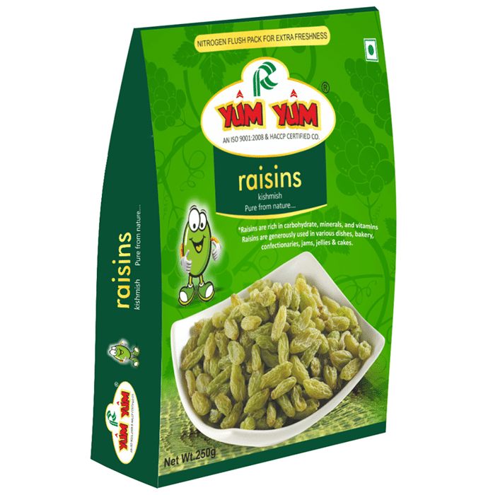 Yum Yum Raisins these raisins have a naturally sweet flavour and can be a healthy snack. You can add them to your breakfast cereals or as toppings to add a sweet element as an alternative to sugar-rich candies and sweet products. It can boost energy and helps you to stay healthy. It can also keep your skin healthy and beautiful. | Key Ingredients Raisins | Key Benefits: It is a healthy and nutritious snack for kids It is 100% natural and gluten-free It helps to reduce your cravings and take care of your overall health It can boost your energy level and give you calorie support It improves the immune system and contains healthy fat | Directions For Use: Take as per your requirement or as directed by the nutritionist. | Safety Information: Read the label carefully before use Store in a cool dry place