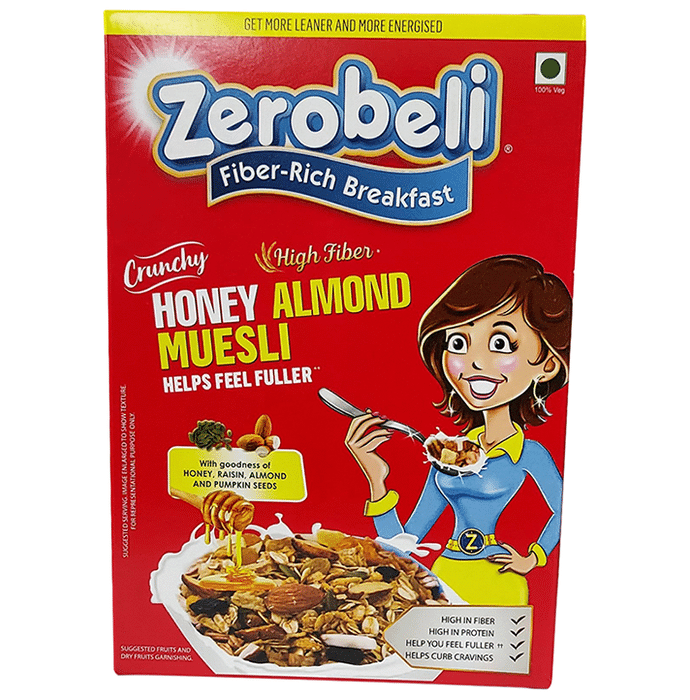Zerobeli Crunchy Honey Almond Muesli Zerobeli Crunchy Honey Almond Oats Muesli is an exclusive blend of almonds, pumpkin seeds, honey, black and golden raisins, complimenting the high-quality exotic muesli. Give the body that extra boost. Count nutrition than calories.
