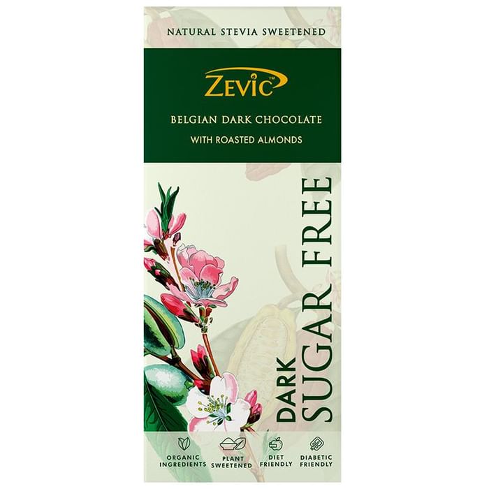 Zevic Sugar Free Belgian Dark Chocolate with Roasted Almonds, Stevia Sweetened, Diabetic Friendly Zevic Belgian Dark Chocolate with Roasted Almonds, Stevia Sweetened, Diabetic Friendly is no sugar chocolate, naturally sweetened with Stevia leaves and it combines the delicious taste of Belgian cocoa with the nutrient rich almonds to make this an ideal snacking bar. It is a great alternative for diabetic patients and it is rich in vitamin E, calcium, phosphorous and iron. Almonds also contains brain boosting nutrients and it helps in improving focus and concentration. Ideally useful for health-conscious people.