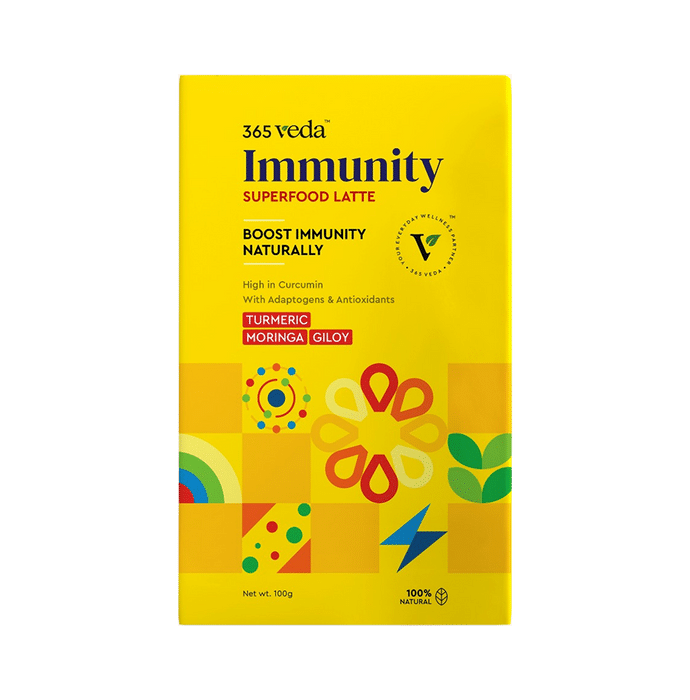 365 Veda Immunity Superfood Latte is crafted by Ayurvedic experts. This immunity superfood with its powerful adaptogens and antioxidants helps boost the immune system, keeping one protected from illness always. While it boasts of the anti-inflammatory and immunity-boosting qualities of turmeric the drink also features black pepper. Infused with the warm flavours of cardamom and nutmeg, a sip of this superfood latte is sure to lift spirits. | Key Ingredients: Turmeric Moringa Giloy | Key Benefits: This moringa rich drink works to replenish the body with vitamin A, iron and zinc While the giloy revitalises the body and helps reduce cholesterol Pepper acts as a catalyst that increases the bioavailability of turmeric's curcumin compounds Ethically sourced, it is free from preservatives, gluten, GMO and added colours | Directions For Use: Take 5gms (1 teaspoon) of 365veda Immunity Latte and add it to a mug Add 150-200ml of dairy/non-dairy, hot/cold milk of your choice and stir well. You can also add 365veda Immunity Latte to oatmeal, yoghurt or smoothies Sweeten with honey and sugar if desired | Safety Information: Store in a cool and dry place away from direct sunlight Read the label carefully before use Keep away from children