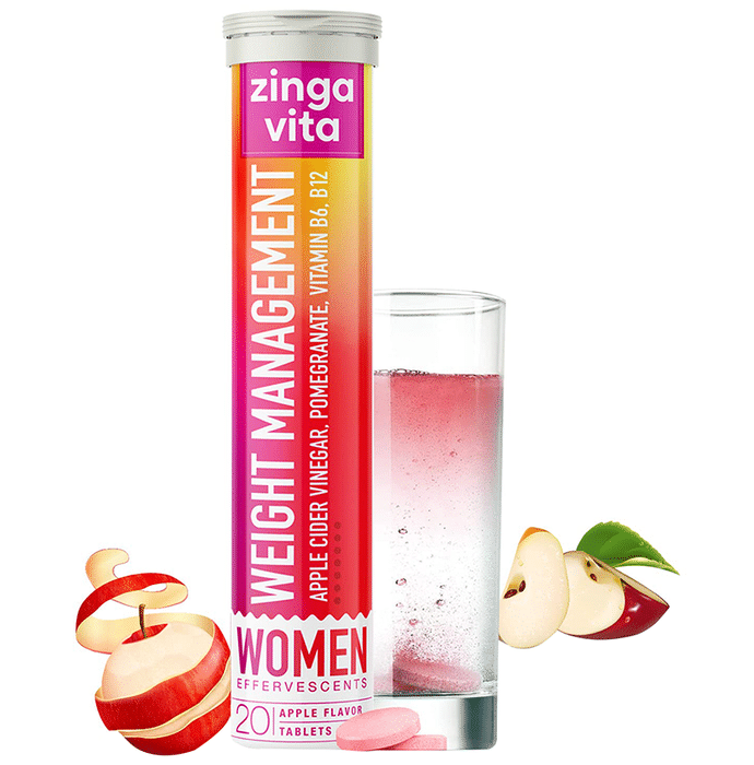 Key Ingredients of Zingavita Women Weight Management Effervescent Tablet Apple: Apple Cider Vinegar (Acetic Acid 6%) Pomegranate extract Vitamin B6 Vitamin B12 | Key Benefits of Zingavita Women Weight Management Effervescent Tablet Apple: Zingavita ACV tablets are packed with B-Vitamins such as B6 and B12 that helps boost metabolism, improve gut health, reduce bloating (especially due to PMS), clear skin and increase energy Zingavita fizzy tabs are manufactured in FSSAI approved, WHO-GMP certified facility These tablets are sugar-free, vegan, gluten-free and allergen-free so you get all of the health benefits with none of the side effects