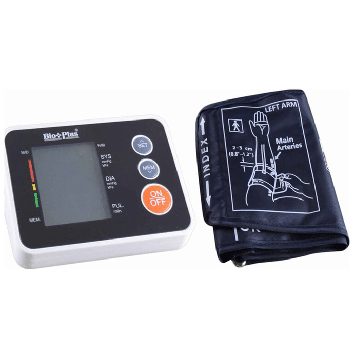 Bio Plus 3rd Generation Blood Pressure Machine helps in irregular heartbeat detection, gives accurate results. The box includes an elegant blood pressure monitor, carry bag, thermometer and power adapter suitable for Indian voltage. | Uses: It is used to detect the blood pressure in the body at any time without having to visit the doctor every time. | Product Specifications and Features: Battery: 6VDC, 4 X AAA alkaline batteries Measurement range: Pressure: 0-300mm Hg Pulse: 40- 199 BPM Weight: 345 gram Cuff circumference: 22-34 cm The cuff is comfortable to wear It comes with a carry bag and an adapter that is suitable for India voltage | Direction for use: Elevate your left arm to the level of your heart and then place on a table and sit still. Then wrap the cuff around the upper part of your arm then check the placement of the cuff. | Safety information: Read the manual carefully before use Keep out of reach of the children Store in a cool and dry place