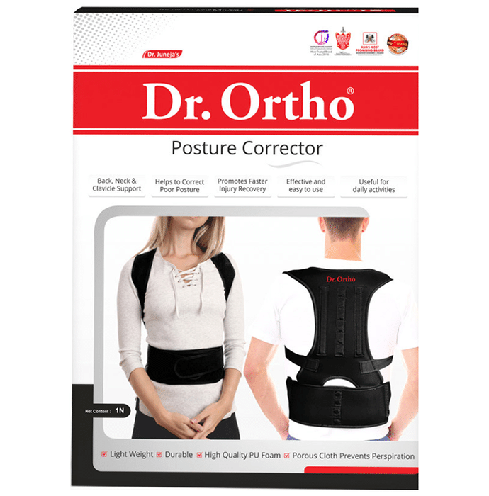 Dr Ortho Posture Corrector is a back brace that helps correct poor body posture to some extent and helps improve the alignment of the neck, shoulders, and back. One of the best qualities of this back posture corrector is that it can be worn under clothes while sitting or working over a desktop for long hours. | Uses: It helps to maintain body posture. | Product Specifications and Features: It is made up of polyester, PU foam (polyurethane foam) and three-layered laminated foam fabric Provides support to the neck, back and clavicle area It helps correct poor posture and promotes faster injury recovery It is helpful for daily activities | Directions For Use: Insert your arms inside the bars like you are carrying a school bag Carrying the posture corrector over your shoulders Buckle up the strap around your lower ribcage according to your comfort | Safety Information: Read the label carefully before use Store in a cool and dry place, away from sunlight Keep out of reach of children