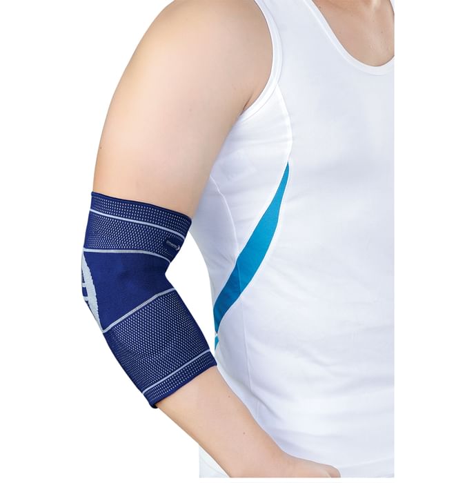 Epi Grip Elbow Brace is a 3d knitted compression braces which combines the aesthetic quality of 3D knitting along with the perfection of fusion technology. | Uses: Wearing a brace can provide relief from pains associated with elbow tendonitis, sprains and strain or post-operative surgery. | Product Specifications and Features: Breathable Material: 3D knitted anatomically contoured breathable brace provides optimal compression and promotes air circulation Pain Reliever: Its anatomical shape silicone pressure relives pain Knitted Elbow Support: Incorporates two anatomically contoured silicone inserts surround the lateral elbow bones Improves Blood Circulation: During movement, it improves blood circulation and produces rapid reduction in swelling and odaema | Directions for use: Slip in the product up the hands so as to allow the blue coloured portion to come on the elbow region. Ensure the silicon pads are positioned on either sides of the elbow joint. | Safety Information: Read the user manual carefully before use Keep out of the reach of the children Keep it at a safe and clean place