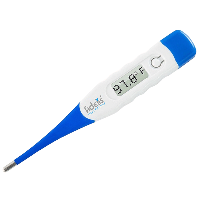 Fidelis Flexible Thermometer Blue Fidelis Flexible Thermometer Blue is helpful for accurately monitoring body temperature and could be used at home. It has a digital display that depicts results in 20 seconds and a flexible tip that makes it more durable and reduces the risk of breakage. It is safe to take oral and underarm temperatures on all adults, children, and babies.