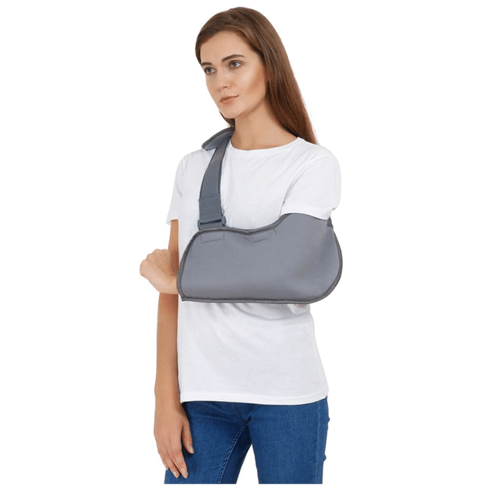 Fidelis Healthcare Arm Sling Medium Grey Fidelis Healthcare Arm Sling Medium Grey supports and immobilises a fractured arm, sprained or dislocated shoulder, sprained and surgically operated arm flexibly. Its ergonomic fit shoulder pad provides comfort while relieving pressure on the neck and shoulder region. It is also helpful in helping a sprained or surgically operated arm in flexion and serving as an envelope for resting the forearm with the elbow bent. It is available in small, medium, large, XL and XXL sizes.