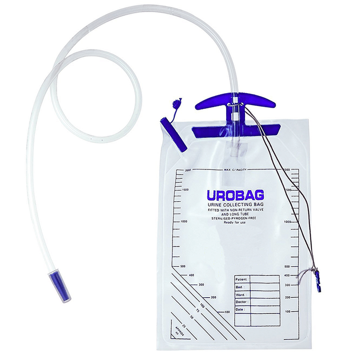 Fidelis Healthcare Urobag Urine Collecting Bag 2000ml comes with a 100 cm long super smooth kink resistant tubing to ensure unrestricted flow. Moulded handle facilitates easy handling of the bag and holds the tube in an upright position to prevent kinking. A two-litre capacity bag provided with 100 cm long super smooth kink resistant tubing ensures unrestricted flow. | Uses: Urine bags are used for collecting urine drained via a urinary catheter. Urine bags are equipped with a connector. | Product Specification and Features: It is modified tapered connector facilitates aseptic catheter urine bag connection The urine collection bag is equipped with an efficient non-return valve with a top outlet Large bore kink-resistant extra soft tube is easy to milk and ensures unrestricted flow A catheter and urine drainage bag because is used for urinary incontinence (leakage) and urinary retention (not being able to urinate) It is moulded handle facilitates easy handling of the bag and holds the tube in an upright position to prevent kinking | Directions For Use: Read the label carefully before use. | Safety Information: Read the user manual carefully before use Store in a cool and dry place Keep away from children