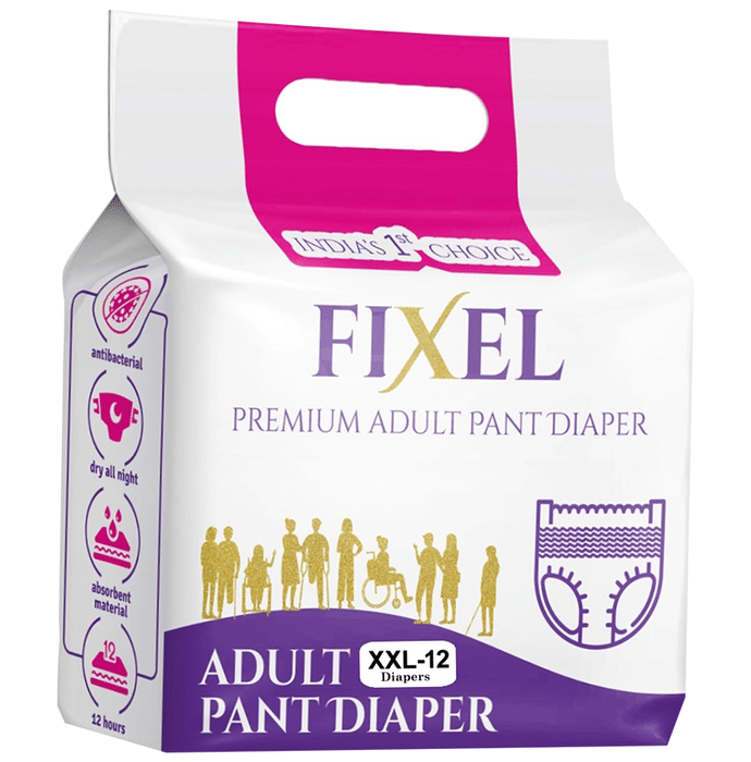 Fixel Diaper Premium Adult Pant helps maintain the personal hygiene of adults. The elastic stretch panel on the waistband provides a comfortable fit. | Uses: It helps to maintain the personal hygiene of adults. | Product Specifications and Features: Fixel adult diaper is comfortable to wear and can be removed easily Anti-bacterial technology does not allow the bacteria to grow, thus protecting the skin The leg cuff assures protection against leakage | Directions For Use: As mentioned on the product label. | Safety Information: Read the label carefully before use Store in a cool and dry place, away from sunlight Keep out of reach of children