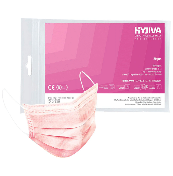 Hyjiva 3 Ply Disposable Face Mask for Children is made with virgin medical-grade technical textiles. These masks are hypoallergenic and soft on the skin. It has three protective layers of ultra-soft odour-less melt-blown fabric, which can prevent the inhalation and exhalation of respiratory droplets. It has an adjustable nose strip, soft elastic ear loops and breathable fabric. | Uses: Three ply disposable face masks are used to cover the nose and mouth to prevent inhalation and exhalation of respiratory droplets. | Product Specifications and Features: Fabric: Melt-blown fabric Size: 5.7 inches x 3.7 inches Layers: 3 protective layers Filteration: Bacterial filtration efficiency > 99% Splash resistance: 160 mmhg Certified by: Iso and ce certified, fully compliant with astm mask protection standards It has a long adjustable nose strip and comprises a wire encased in a flexible plastic strip The mask has soft round elastic to maintain chafing This disposable mask has low breathing resistance It has a lattice hemming stitched edge and a solid ear-loop weld, which can eliminate the possibility of snapping | Directions For Use: Before touching the mask, wash your hands with soap or an alcohol-based sanitiser Use the ear loops to hold the mask and place the white side over the mouth and nose Adjust the bendable nose strip to ensure the right fit and to avoid any leakages | Safety Information: Follow the instructions mentioned on the box carefully Store in a safe and dry location The mask is for individual use only, not to be shared with others to prevent contamination Misuse or improper use may lead to adverse effects and decreased effectiveness