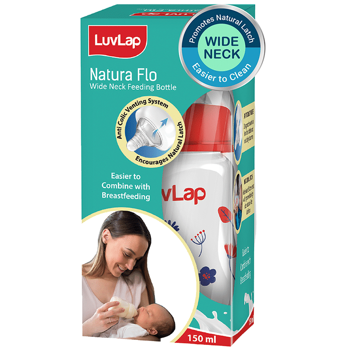 LuvLap 3M+ Natura Flo Wide Neck Feeding Bottle comes with a medium-flow teat designed to feed the baby with utmost care and gentleness. The bottle bears a wide neck to provide the experience of hassle-free feeding. | Uses is used in feeding milk or water to babies at home or in public places | Product Specification and Features Comes with a comfortable latch and round grooved teat The bottle is sturdy and prevents the nozzle from collapsing This feeding bottle is BPA free and environmentally friendly It can be sterilised without being damaged Advanced anti-colic valve vents air into the bottle instead of the baby's tummy The shape of the bottle is comfortable and easy to use | Directions for use Angle the bottle, so the neck of the bottle and the nipple stay full of food. | Safety information Read the label carefully Do not let your child hold the bottle on their own Store in a cool, dry place Recommend changing teat after every three months