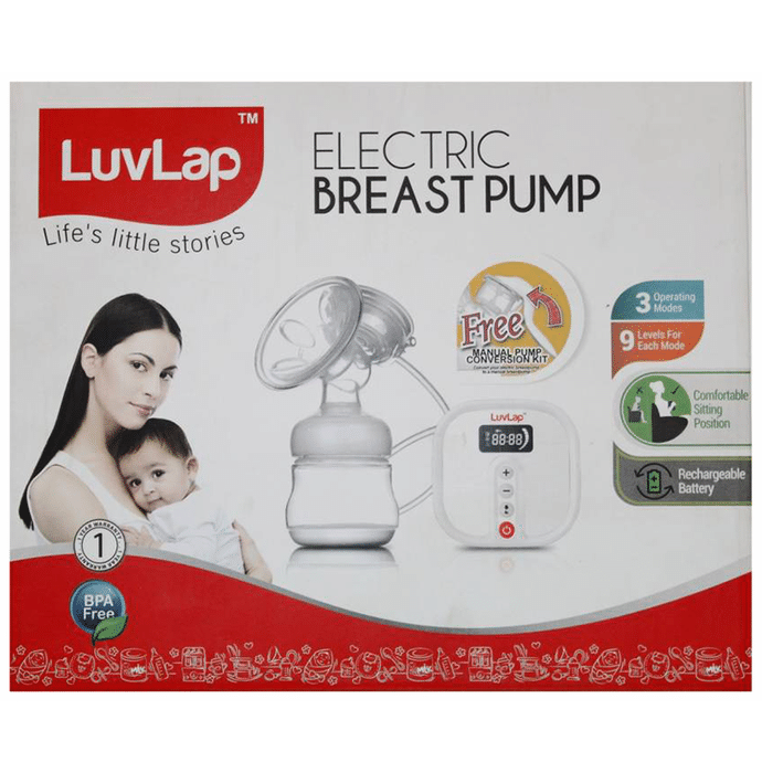 LuvLap Electric Breast Pump is useful for working or travelling women who are unable to breastfeed their babies due to their work or travel circumstances. It contains a rechargeable battery and allows milk pumping while sitting in a comfortable position. A closed pumping mechanism prevents milk from flowing back into the suction tube. | Uses: LuvLap Electric Breast Pump is useful for working or travelling mothers who cannot stay with breastfeeding babies. | Product Specification and Features: LuvLap Electric Breast Pump is beneficial for working or travelling women who are unable to breastfeed their babies due to working or travelling conditions It contains a rechargeable battery and allows milk pumping while sitting in a comfortable position Back-flow of milk into the suction tube is prevented by using a closed pumping mechanism | Directions For Use: Use as directed on the label or as advised by the physician. | Safety Information: Read the label carefully before use Store in a cool and dry place away from direct sunlight Keep out of reach of children