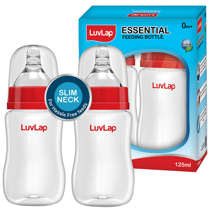 LuvLap Essential Feeding Bottle Slim Neck 0m+ (125ml Each) comes with a slow-flow teat designed to feed the baby with utmost care and slowness. The bottle bears a slim neck to provide the experience of hassle-free feeding. | Uses is used in feeding milk or water to babies at home or in public places | Product Specification and Features Comes with a comfortable latch and round grooved teat The bottle is sturdy and prevents the nozzle from collapsing This feeding bottle is BPA free and environmentally friendly It can be sterilised without being damaged Advanced anti-colic valve vents air into the bottle instead of the baby's tummy The shape of the bottle is comfortable and easy to use | Directions for use Angle the bottle, so the neck of the bottle and the nipple stay full of food. | Safety information Read the label carefully Do not let your child hold the bottle on their own Store in a cool, dry place Recommend changing teat after every three months