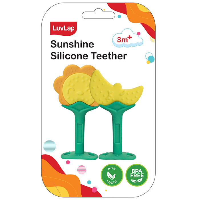 LuvLap Sunshine Silicone Teether 3m+ contributes to the baby's sense of teething and helps stimulate the natural development of the jaws. It soothes gums. It is designed with BPA-free silicone, which makes it secure for infants to chew. | Uses this attractive silicone teether is designed to provide comfort to the baby during their teething phase | Product Specification and Features This silicone teether comes with a multi-sensory texture with ridges and grooves It is incredibly soft, durable, and flexible It supports the baby's natural development of teeth It is free from BPA and hence, stands as an eco-friendly goody This teether provides relief to the baby's gentle gums | Directions for use Rinse the teether in warm water thoroughly before and after using it , | Safety Information Read the label carefully before use Do not let your baby swallow the product Store in a cool, dry place Change the teether within three months