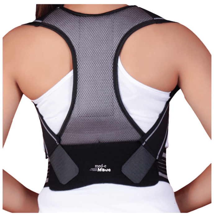 Med-E-Move Posture Corrector XL Med-E-Move Posture Corrector Child is useful for assisting with posture correction, lumbar abnormalities and crookback posture. It has padded straps that relieve pressure on the shoulders and axilla. Its twin splints in the centre provide additional spine and neck support. It can be worn when walking, exercising, or working, and it helps to rectify posture deformity. It is available in small, medium, large, XL and child sizes.