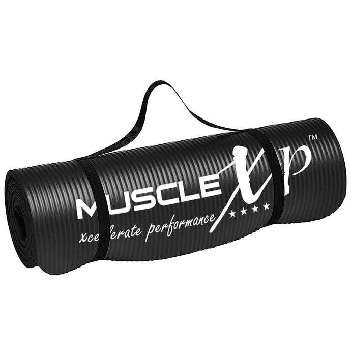 MuscleXP Yoga Mat 10mm Black MuscleXP Yoga Mat 10mm Blue is made using premium quality NBR material, making your yoga or fitness practice more enjoyable and comfortable. The surface texture (10 mm) is thicker, and the fine-grip line design provides a firmer grip and support. Its rubbery surface prevents slipping and sliding. The thick mat, combined with a cushiony feel, offers excellent comfort and relief for men and women with fragile and sensitive joints. In addition to the quality of the material and construction, it is moisture- and sweat-resistant, preventing a greasy feeling while exercising. The mat is very simple to maintain and clean with its water resistance. The integrated black carry strap makes it convenient and controllable for hassle-free travel and transportation.