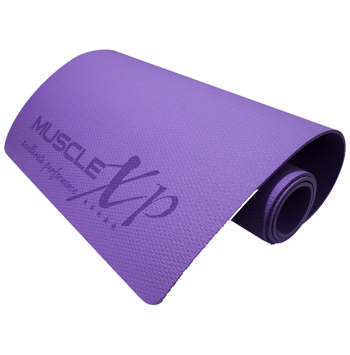 MuscleXP Yoga Mat with Cover Strap 6mm Purple MuscleXP Yoga Mat with Cover Strap 6mm Purple is crafted using pure EVA material with non-slip surfaces. The 6mm thick all-purpose mat conveniently cushions the spine, hips, and elbows with high-density durable EVA material while working on hard floors.