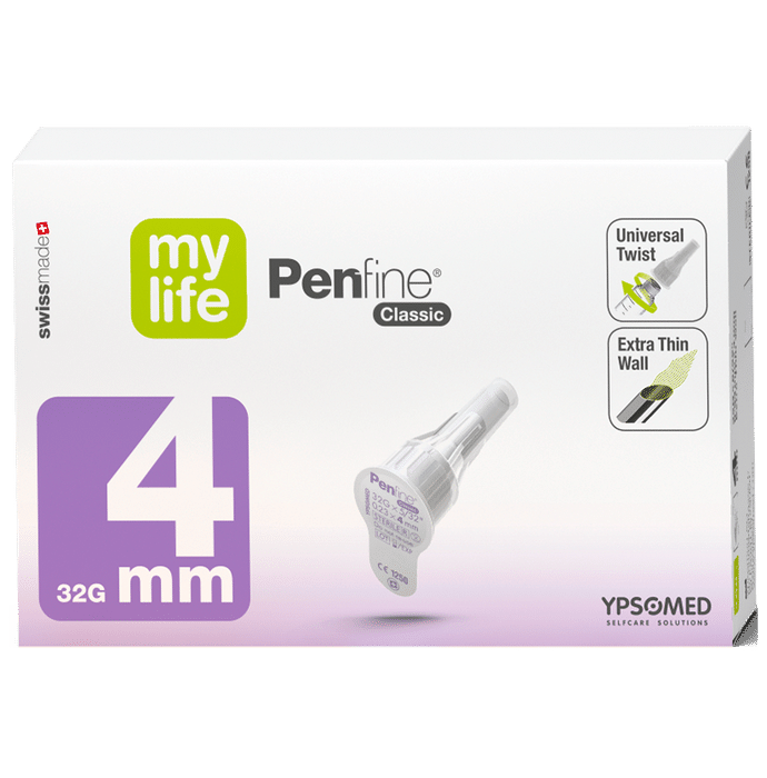 My life Penfine Classic Pen Needle 4mm 32G contain high-quality needles featuring an extra thin wall and universal twist. It works effectively with leading injection pens available. | Uses: It is used to inject insulin. | Product Specification and Features: Thin walls to facilitate easier penetration and faster action Special silicone surface treatment and triple facet bevel for maximum injection comfort Supports the simple delivery of higher concentrated insulins | Directions For Use: Use as directed. | Safety Instructions: Read the label carefully before use Store in a cool dry place away from direct sunlight Keep out of reach of the children