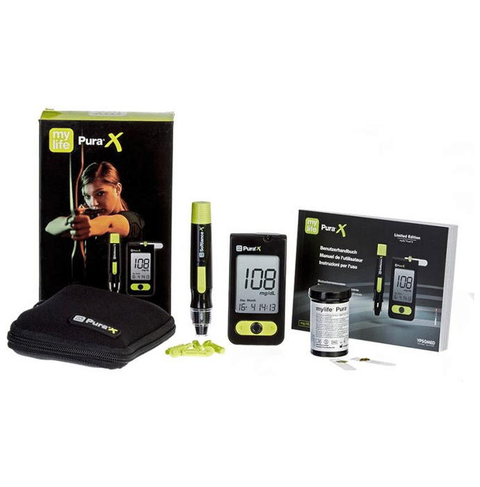 MyLife Pura X Blood Glucose Monitor with 60 Strips is useful for monitoring blood sugar and levels and delivers quick and accurate results. The device recognises the strip code automatically and has a large display screen that allows for simple results viewing and is readable day and night. | Uses: It helps to keep blood sugar levels in check. | Product Specifications and Features: Measurement time: 5.0 seconds Measurement temperature: Ambient: 18 to 30 C MyLife Pura X blood glucose monitor is beneficial for monitoring blood sugar and levels and provides quick and precise results The device automatically identifies the strip code, and the results and data can be transferred to Mylife software It has a large display screen which makes it easy to view results and readable by day and night due to the illuminated display | Directions for Use: Take the large and solid test strip out of its vial and close the box again The device activates automatically and recognises the strip code (auto coding) Prick your finger with the mylife Softlance lancing device Apply the blood from above onto the test strip. The channel absorbs up the blood sample while the blood sample window on the test strip shows the filling level Read the measurement on the LCD Hygienic removal of the test strip without blood contact Clean lancet removal without blood contact | Safety Information: Read the label carefully before use Store in a cool and dry place, away from sunlight Keep out of reach of children | Quick Tips: For in-vitro diagnostic use only Discard any remaining test strips three months after the first opening of the vial Do not take any medical decisions without consulting a doctor Always discuss the results with a registered medical practitioner It is wise to check the test strips carefully before use for better results Always check the expiry date on the test strips and lancets before buying. This is because the use of outdated strips can give incorrect readings and, thus, serve no purpose Do wash the hands thoroughly with an antiseptic hand wash before the test Do not squeeze your finger when taking a blood drop sample | Frequently Asked Questions: Can blood sugar strips be reused? No. All the blood glucose test strips are for single use only. Do not reuse a test strip, as it may not provide the appropriate results. It is strongly advised always to discard a test strip after every use. Can a lancet be reused? No. Lancets are for single use only. It is strongly advised always to discard a lancet after every use. Use a new sterile lancet every time you test to help avoid infection and improve comfort and performance. What is a normal blood glucose meter, called a glucometer reading? According to the American Diabetes Association, the fasting or preprandial blood glucose levels for diabetics should be between 80 – 130 mg/dl, and postprandial (1-2 hours after meals) should be less than 180 mg/dl. However, the range mentioned in the glucose monitor may be a little different. So, speak to the doctor to calibrate the results with the lab reports. How do blood glucose monitors work? Diabetes devices or glucometers test the amount of glucose in the blood. The test strips in glucometers contain an enzyme glucose oxidase, which reacts with glucose in the blood and sends the result as an electronic signal displayed on the monitor. How often should you test your blood glucose levels? In the case of type 1 diabetes, check the blood glucose levels several times a day, such as pre and post-meals and before and after exercise or as advised by the doctor. Whereas, in the case of type 2 diabetes, monitoring the sugar levels might be based on the severity of the condition, which can be several times a day, once a day, or thrice a week. Hence, talk to the doctor about how often blood glucose levels should be tested.