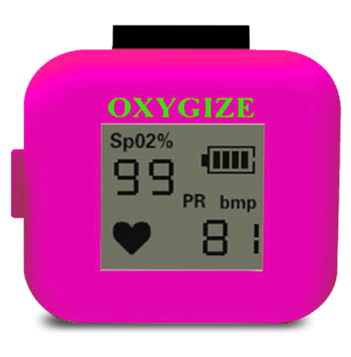 Oxygize Premium Ring Pulse Oximeter Pink Oxygize Premium Ring Pulse Oximeter helps to check pulse oxygen saturation (Sp02) and pulse rate (PR). It's a small, compact, simple, reliable, and durable physiological monitoring device. It includes the mainboard, an LCD display, and a lithium battery. The device can be used in hospitals and health care organizations, oxygen bars, and during family nursing and physical activities like sports (you can use it before or after the sport, but it is not recommended to use it during the sport).